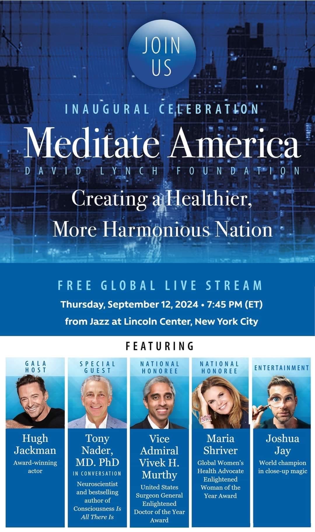 Le Lincoln Center à Manhattan accueille ce 12 septembre un Gala de charité de haut niveau: musique Jazz, cocktail de bienvenue et banquet, émerveillement avec le prestidigitateur Joshua Jay, invités de marque. Il s'agit de lever des fonds pour permettre à tous les urgentistes et professionnels de la santé qui le souhaitent d'accéder aux bienfaits éprouvés de la technique de Méditation Transcendantale (MT).